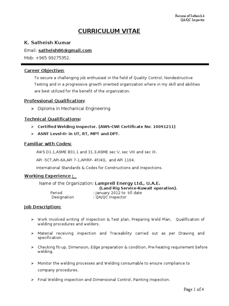 Welding Inspection Qc Mande Blog from ngsuyasa.files.wordpress.com Qa /qc welding inspector | south australia. Fully qualified representative capable of field and laboratory work to support the mtsi division with minimal direction. Page 1 of 4 welding instructor 01/14/08 east valley institute of technology job description job title: Interpretation of codes and specifications in accordance with the drawing requirements; Welding inspectors ensure that the work produced by welders meets specifications for quality and safety.